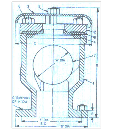 La válvula de liberación de aire deberá emplear el principio de funcionamiento cinética con una parte móvil, una bola boya de acero inoxidable. La válvula deberá estar diseñada de tal manera que cuando el orificio grande está abierto, la bola permanece en el área de la garganta y sin la posibilidad de la válvula de soplado de cierrar o permitir el colapso de la pelota. La válvula se cerrará cuando el agua sale por la válvula para levantar la bola para el asiento del orificio. El cuerpo de la válvula deberá ser de hierro fundido.